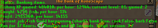 I just had 1 question for ya, I don't have the best computer, and I am only running 2 clients, when I run the fishing script it really depletes my CPU and it ends up freezing after I fish about 50-100 lobsters, I am trying to find a way to get it to run without freezing and I have no other windows or anything open but it still does it. Do you have any suggestions? I just have a crappy acer computer, and if need be I guess I can just run 1 client at a time so it can handle this script. Any input at all would be greatly appreciated! Thanks again man, and great work :D