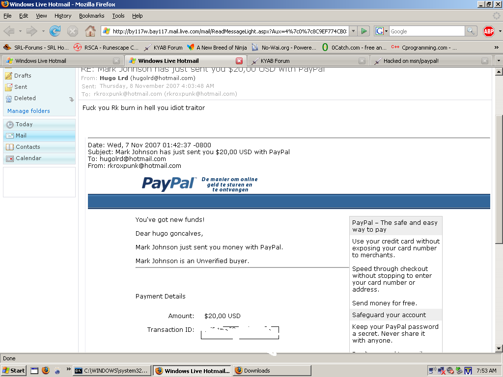 omfg all my paypal cash that i was saving up for RS memberships is fucking gone and my personal msn account is hacked.