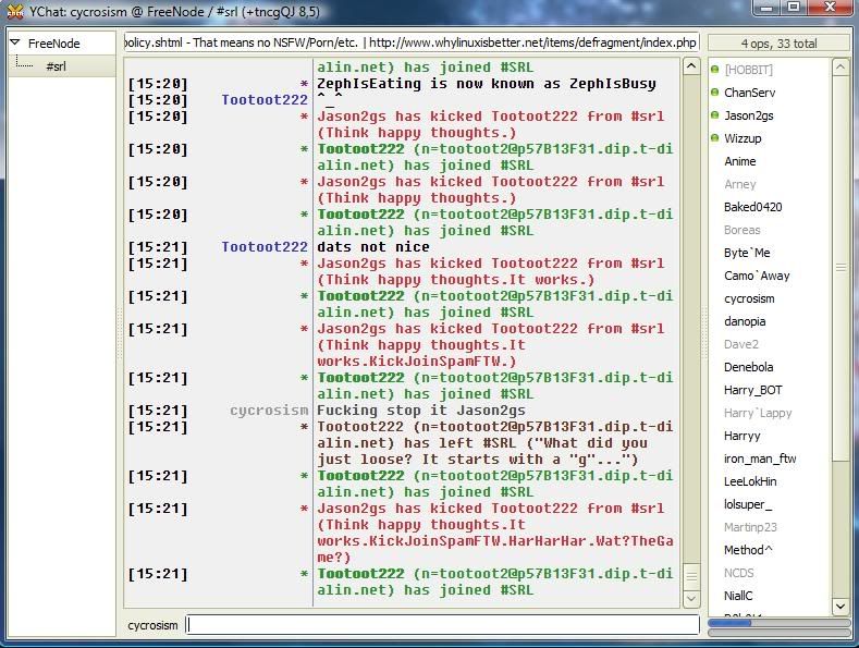 A lot of kicking. When you consider that a kick is harmless, and in most cases on our IRC channel considered a joke, I can hardly see how a person could get upset over this. Especially anyone other than the person who was being kicked.