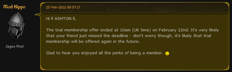 Okay, so get this. J(F)agex started a members trial. Big whoop, or big fail? Lately, I'm not really sure if this will "lift" the 25k trade limit. If it does, me and a lot of others will be happy.